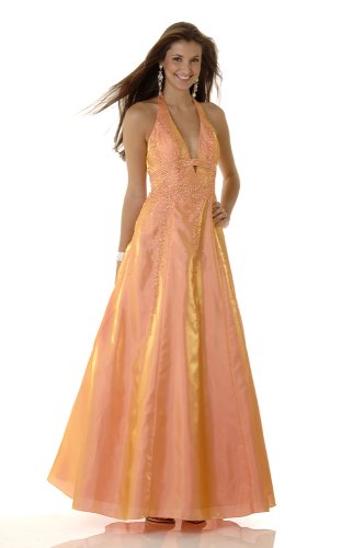 Iridescent taffeta A-line gown with a halter V neckline and elegantly scattered beading Read more...