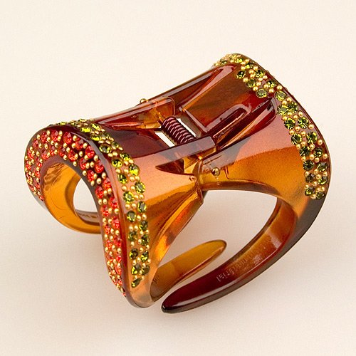 Designed with a streamlined style, the curved edges of this amber claw clip sparkle with more than 150 ruby and peridot colored Swarovski Crystals plus over 300 tiny golden flecks for added detail. Four interlocking teeth connect to hold a surprisingly generous amount of hair in a ponytail or twisted up-do.
