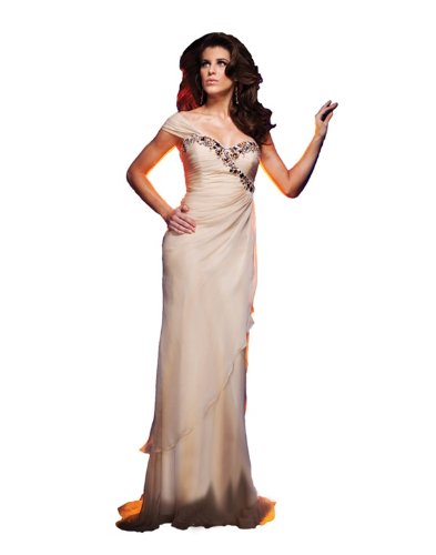 Tony Bowls TBE 11117, Off-the-shoulder column gown with glittering edging by Tony Bowls 2011 Evening. Review