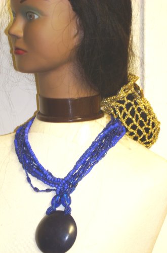Hand Crocheted Gold Metallic Gimp Dress Snood Mounted on French Clip with Three Gold Buttons for Women and Teens Offered in Combination with Twelve Strand Multicolor Small Beads Ethnic Necklace Read more...